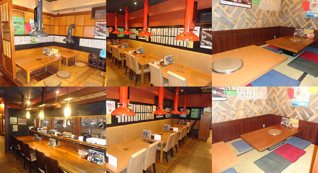 昔ながらの七輪を囲んで、家族みんなでおいしい焼肉 店舗住所 秋田市外旭川八柳3-11-5 電話番号 018-868-4129 営業時間 17:00~00:00(年中無休!) 店内案内 こあがり席(7席)・・・掘りごたつ。冬は足元ぽかぽかです。 カウンター(8席)・・・オープンキッチンでライブ感が楽しめます。 テーブル席(5席)・・・ソファでゆっくりくつろげます。 お座席(4-8名様)・・・宴会にもぴったりな個室完備。